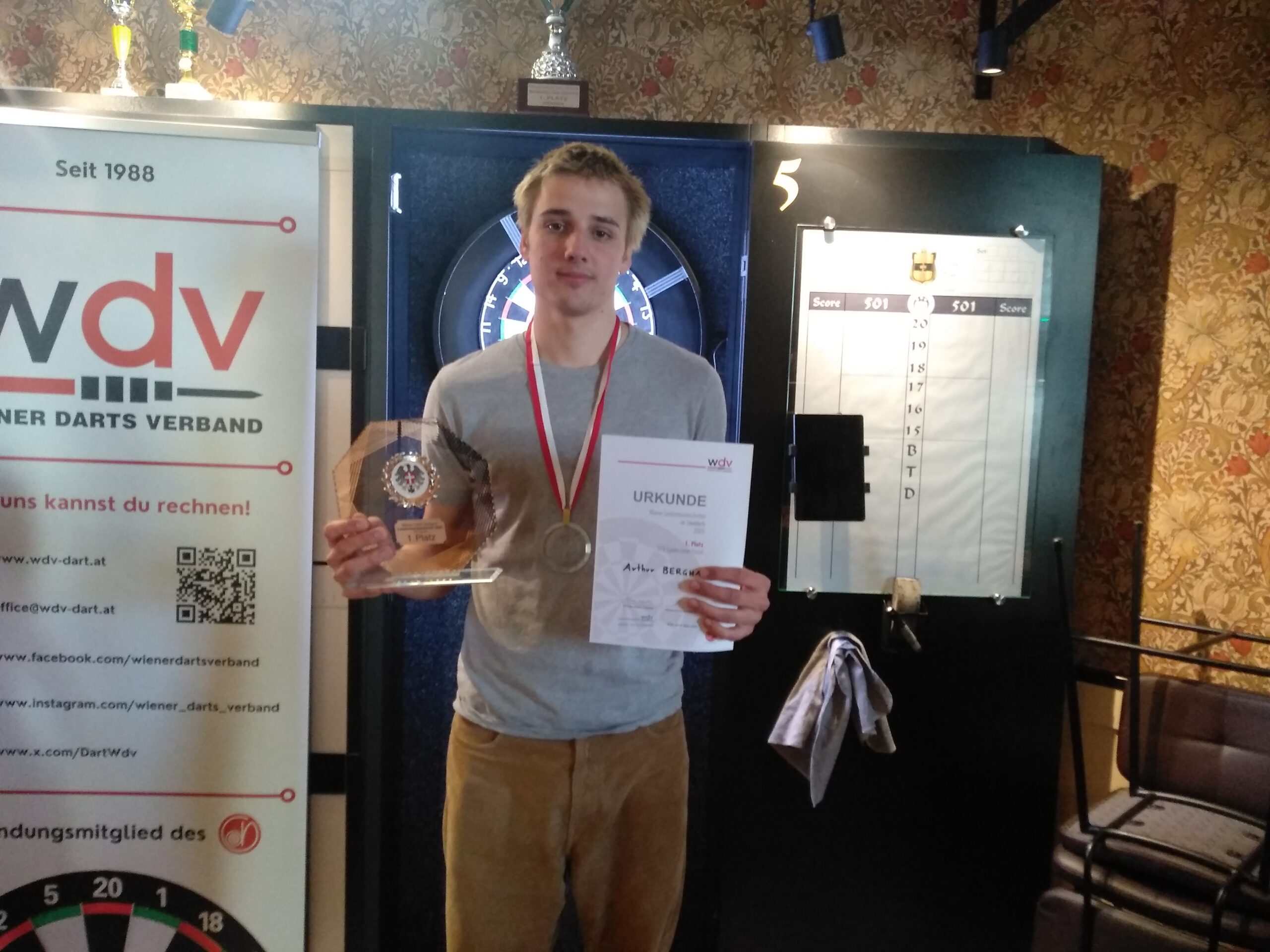 Am Sonntag startete der Tag bereits um 9:30 mit den Bewerben der Jugend und Senioren. Im erstmals ausgetragenen U23-Bewerb trat dabei Arthur Berghammer an und ging gemessen an den Ligastatistiken sogar als Favorit ins Rennen. Dieser Rolle wurde er mehr als gerecht: Er gewann die 4er Gruppe zunächst souverän mit drei 3:0 Erfolgen und dominierte anschließend auch das Endspiel gegen Julian Biedermann mit 4:0. Somit ist Arthur ohne Legverlust Wiener U23-Landesmeister! Wir gratulieren herzlichst und freuen uns sehr über diesen fantastischen Auftritt, der An Sporran eine Goldmedaille bescherte!